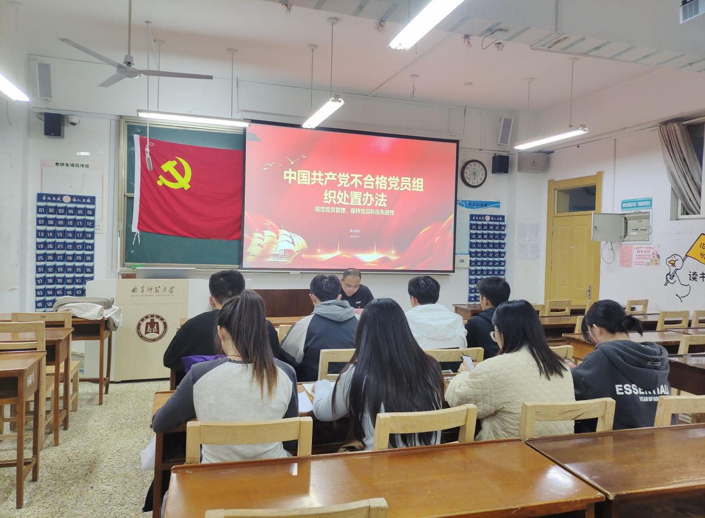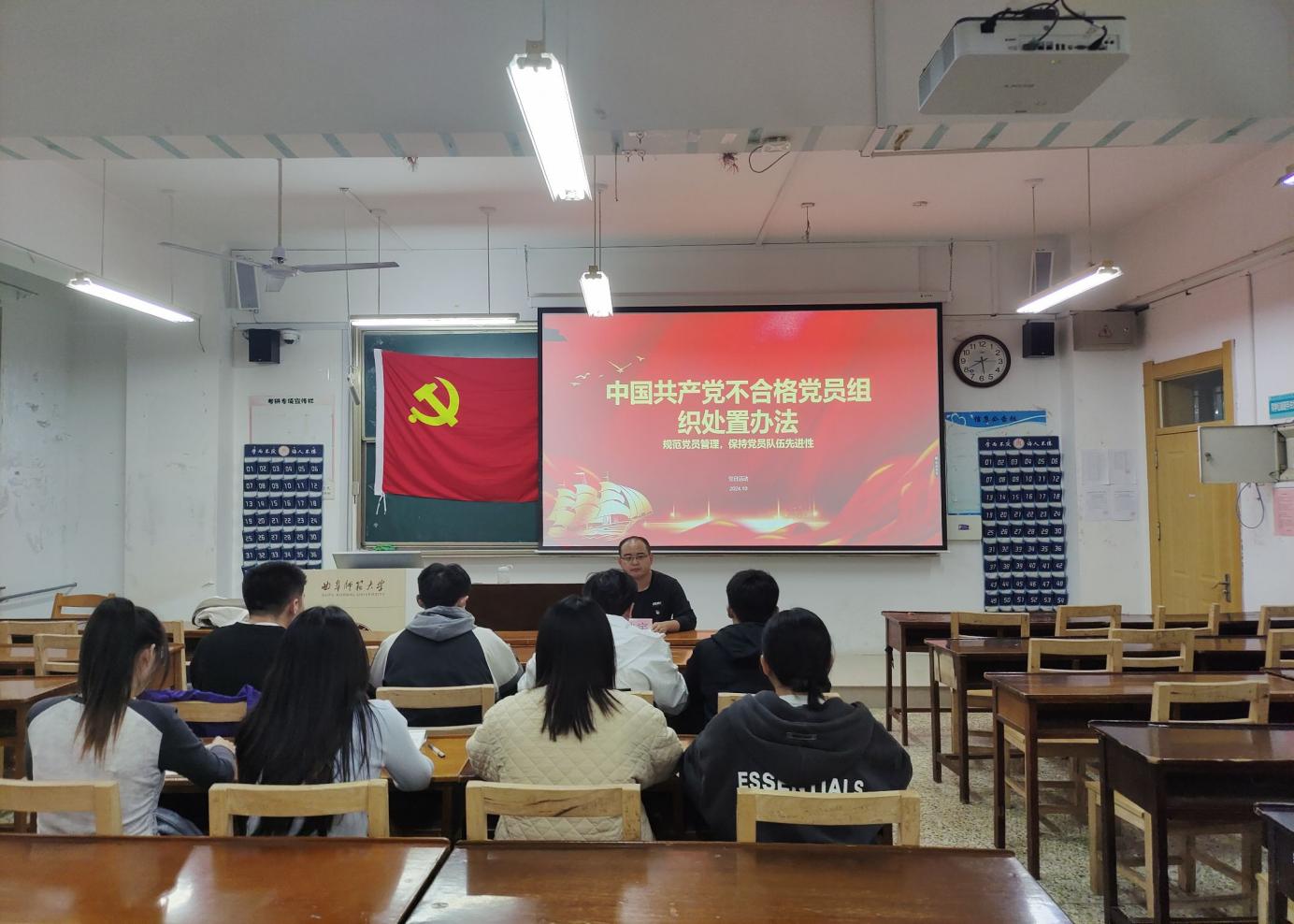首先,支部书记刘兆宇带领大家学习了《中国共产党不合格党员组织处置办法》的各项内容,并强调学生党员应坚持以习近平新时代中国特色社会主义思想为指导,深入贯彻习近平总书记关于党的建设的重要思想,认真落实新时代党的建设总要求和新时代党的组织路线,在政治、思想等方面严格要求自己,提高党员队伍建设质量。