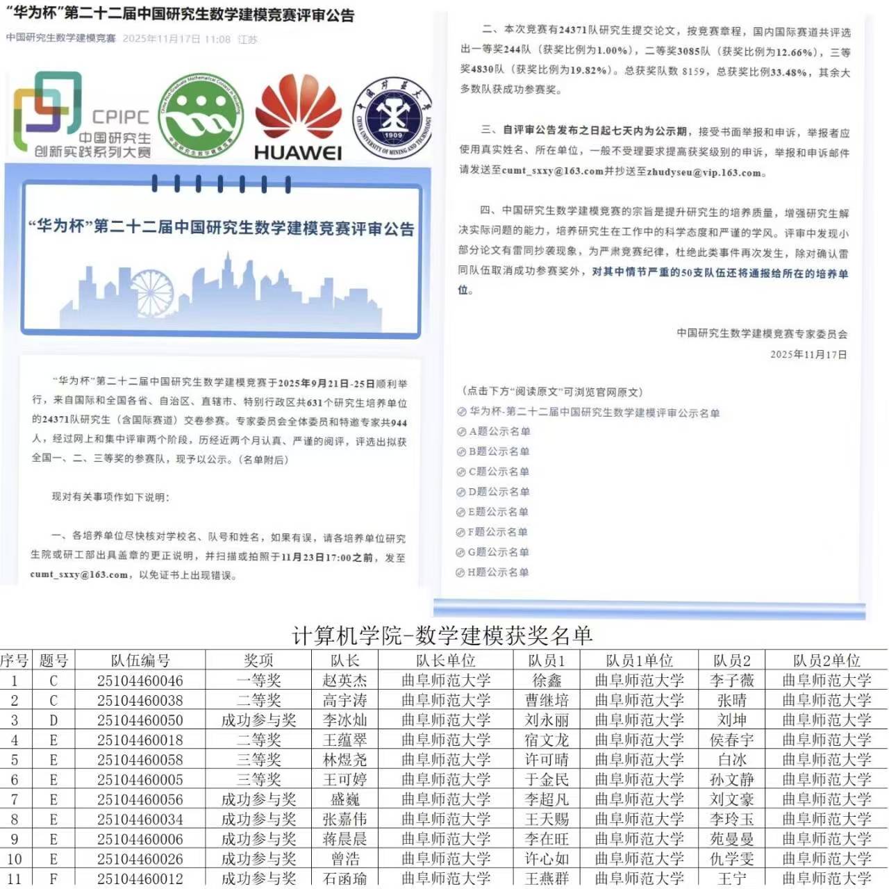 11月17日,第二十二届“华为杯”中国研究生数学建模竞赛获奖结果揭晓,五楼自拍