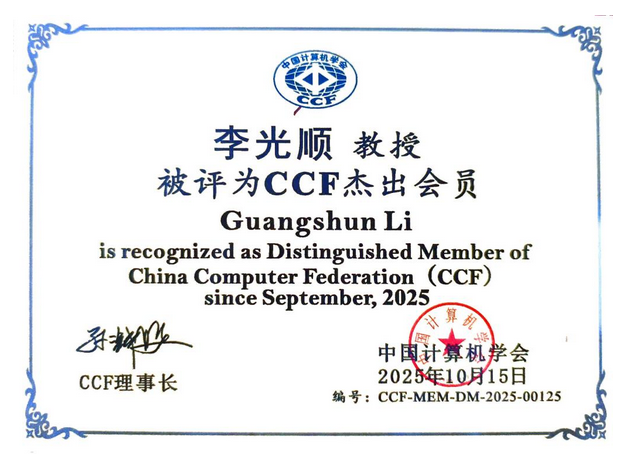 2025年成功引进长江学者1人,获批山东省泰山特聘专家1人,获评中国计算机学会杰出会员1人(见图5),入选山东省重点扶持区域引进急需紧缺人才1人,获评山东省青创团队带头人1人,获评山东省科技副职工作表现突出个人1人,获评日照市巾帼建功标兵1人,充分展现出学院人才队伍的综合实力与广泛影响力。
