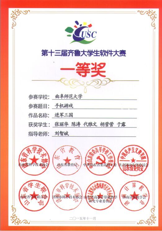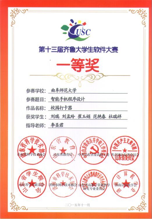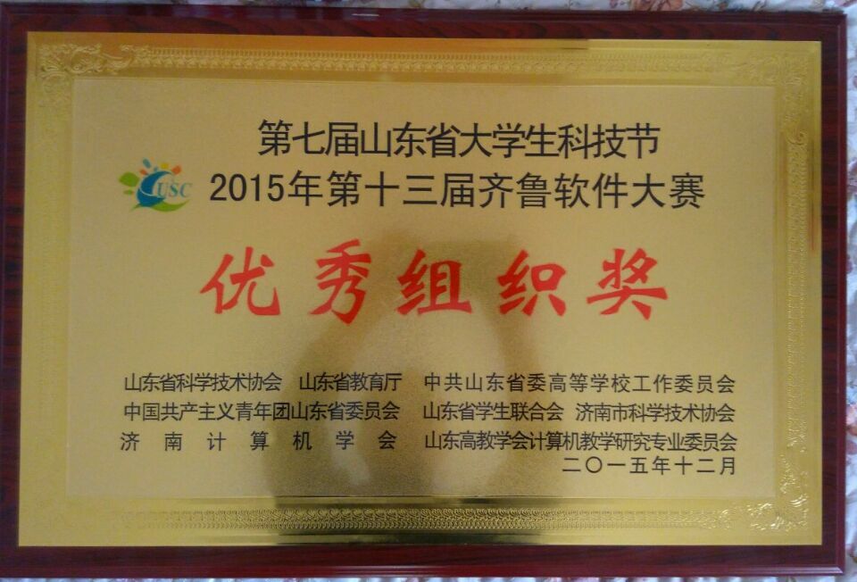 2015年12月5日上午,第七届山东省科技节系列活动之第十三届齐鲁大学生软件设计大赛颁奖大会在山东建筑大学举行,信息科学与工程学院在本次比赛中获得一等奖两项、二等奖四项、三等奖六项,刘智斌、李圣君两位老师被评为优秀指导教师,学院被评为优秀组织单位。