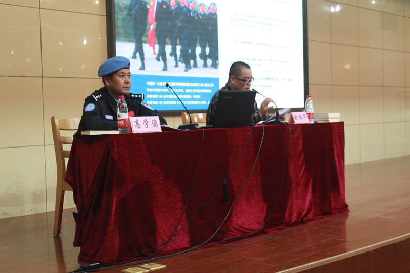 “我们一直都在生存,还没有达到生活的标准。”高学德首先简单介绍了中国第一支赴利比里亚维和警察防暴队,之后将更多的时间留给学生,通过学生的问题,将更多的真实维和故事、更饱满的铁血维和英雄展现于学生眼前。在被问到得以坚持的理由时,他回答道,使命和承诺。肆虐的蚊虫、令人忌惮的毒蛇、随处可见的蟑螂蜥蜴、随时随地的敌人,在恶劣的环境里,他们心中“大道惟诚,无信不立”的旗帜不倒。稍后,张振华对问题作了补充,他谈到,除了使命、担当外,还有对家人的深深思念、一种要回家的信念支撑着他们走下来。