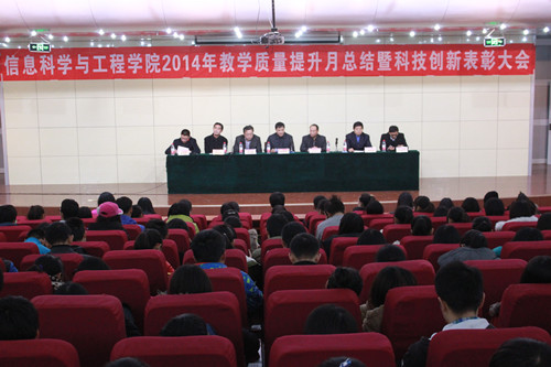 青年学子展风采,科创大赛逞英豪。2014年12月31日下午4点,信息科学与工程学院在图书馆报告厅隆重举行2014年教学质量提升月总结暨科技创新表彰大会,学校纪委书记、日照校区管委会副主任郭辰夫,华为高级讲师代表肖宗鹏,信息科学与工程学院相关领导出席本次大会。