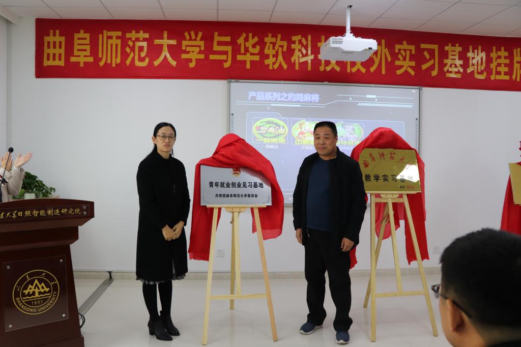 日照高新区创业中心主任张进生与信息科学与工程学院党委书记张书东共同为教学实习基地揭牌,华软科技有限公司总经理王民乐与团委副书记刘蓉共同为社会实践基地揭牌,揭牌仪式圆满结束。