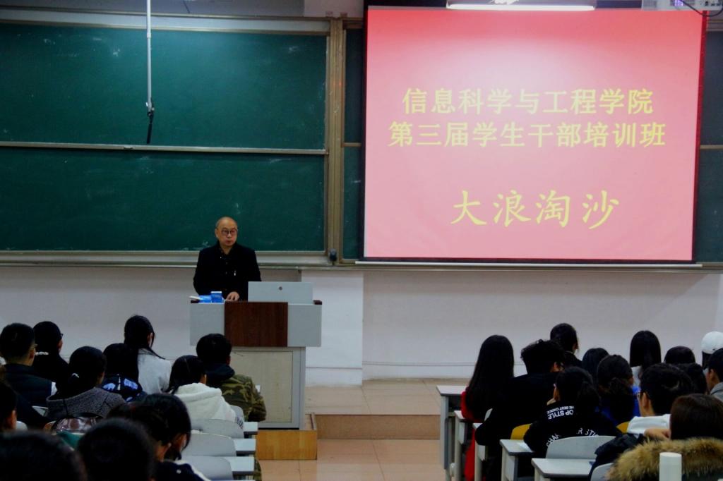 为提高学院学生管理工作水平,促进学生干部健康成长发展,进一步彰显学院工作影响力,11月16日上午8点,信息科学与工程学院“青马工程”大学生骨干培训暨第二十九期团校在JA105教室正式启动。校团委副书记刘蓉、心理健康指导中心指导老师陈学宁、信息科学与工程学院党委副书记肖龙航、本科生党支部书记于运清、辅导员鲁瑞丽出席本次会议,2019级全体学生干部参加培训。