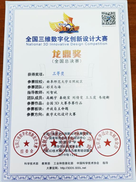 近日,我校信息科学与工程学院刘智斌指导的参赛队伍--彩贝与海在全国三维数字化创新设计大赛中斩获龙鼎奖,这是我校首次在全国三维数字化创新设计大赛中获此殊荣。
