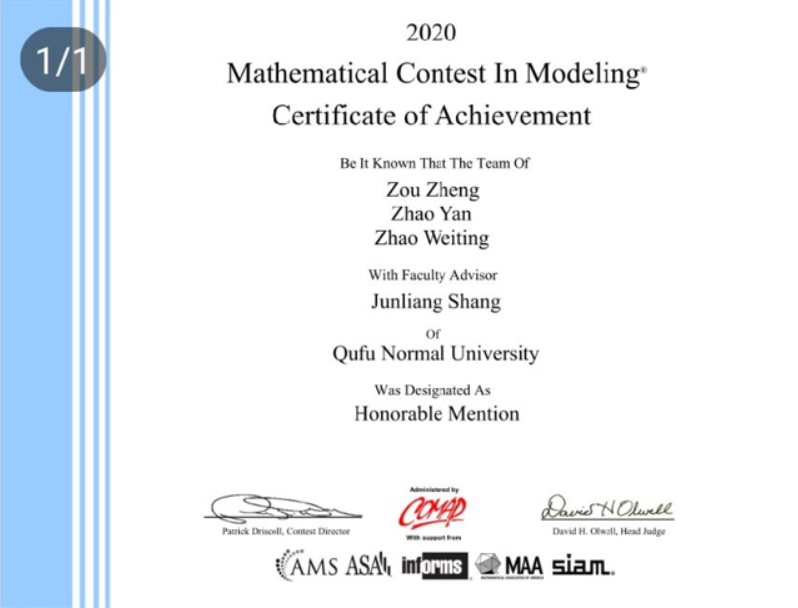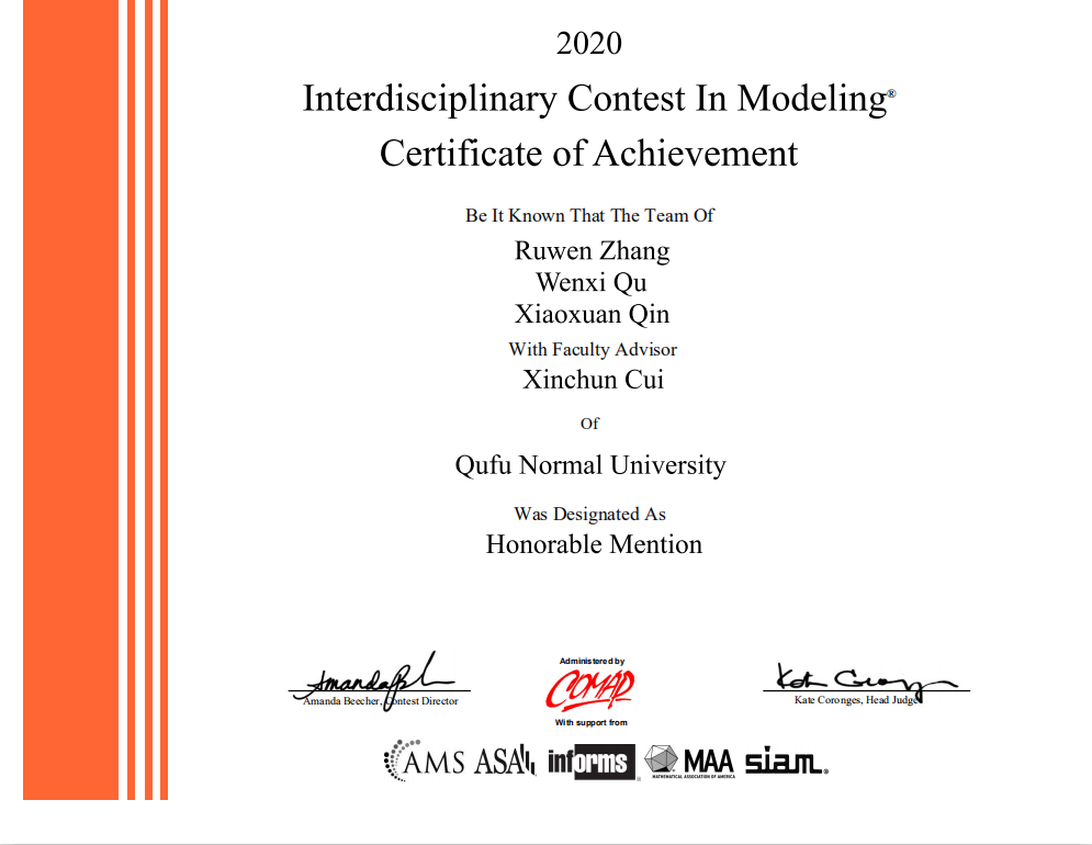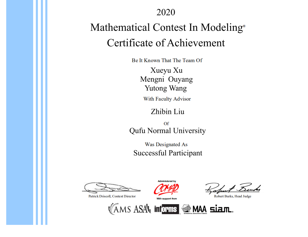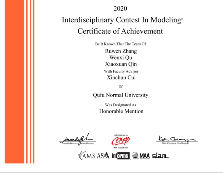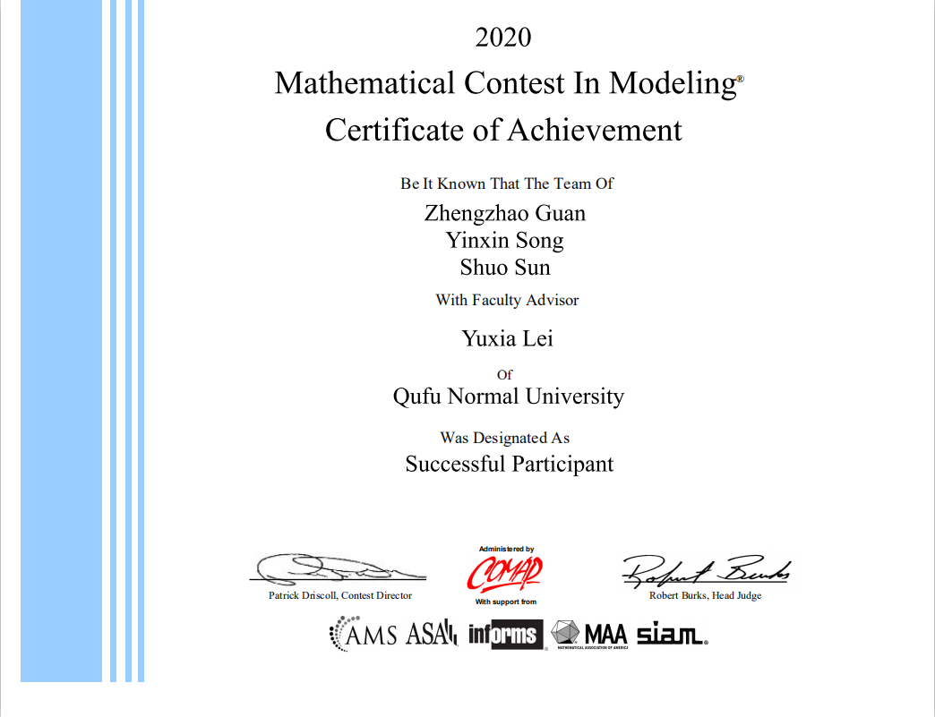 近日,2020年美国大学生数学建模竞赛(MCM/ICM)评选结果正式公布,信息科学与工程学院代表队在这次竞赛中取得了优异的成绩,其中,二等奖(Honorable Mention)5项、成功参赛奖(Successful Participant)6项。