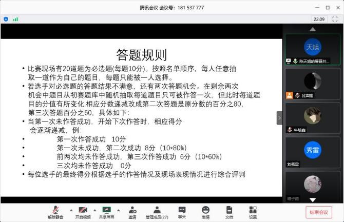 上午10点15分,比赛拉开序幕。首先,由主持人陈天旭介绍比赛章程、参赛人员。随后,主持人宣布比赛正式开始。本次比赛采用随机抽签的方式,参赛人员按照初赛成绩依次选择心仪的题号,在主持人宣读题目结束后进行作答。最后,由协会中各个部长担任评委为参赛成员点评打分,指导老师根据各位成员的表现进行风采点评。经过一个多小时的角逐,比赛落下帷幕。在比赛过程中,参赛同学沉着冷静,依照所选题目进行清晰准确地作答,其游刃有余、沉着冷静的形象让各位评委及老师印象深刻,鼓掌称赞。