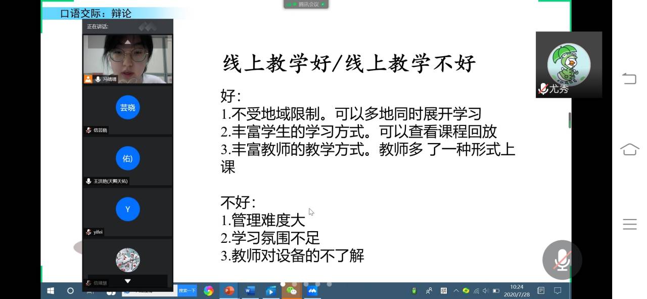本着“寓教于乐”的教育理念,老师们将专业知识进行趣味拓展,力求同学们在学习知识的同时感悟学习的快乐。上午九点,英语老师给六年级的学生们带来了一节特殊的英语课——“About China”,课程主要围绕中国美食文化展开。首先由英语老师带领学生认真朗读、学习相关英语单词。随后通过对话互动激发同学们对英语的学习兴趣,让同学们在收获英语知识的同时了解中国博大精深的美食文化。第二节课准时开始,语文老师别出心裁,为六年级同学量身定做了语文辩论课,辩题为“线上教学的优缺点”。老师积极引导同学们结合时事多角度思考问题,希望以辩论课的形式锻炼同学们的思维,提高同学们的语言组织能力。眼保健操过后,儒学文化课开始了。儒学老师充分发挥曲园学子的优势,通过孟母三迁的故事让莘莘学子身临其境,并通过相关视频让学生们深入了解孟子的生平事迹,同学们受益匪浅,对儒家经典也有了自己的心得体会。至此,上午课程顺利结束。