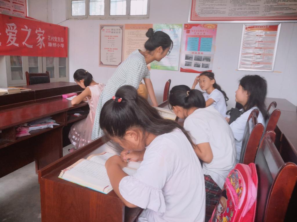 这是个由村校携手办成的专门为留守儿童义务教学的场所。从老师的口中我们了解到,大部分留守儿童都是和爷爷奶奶生活在一起,他们很少会像年轻的爸爸妈妈那样重视孩子们的学习问题,所以一般放长假都不会把孩子们送去补习班。再有就是经济条件不允许的情况也影响了孩子们的假期学习。在这里,村委会免费提供党员活动室给孩子们作为场地,空调饮水机电视桌椅板凳硬件设施一应俱全。村小学安排就近的在职老师给孩子们进行义务教学,同时将学校图书馆藏书带给孩子们阅读。