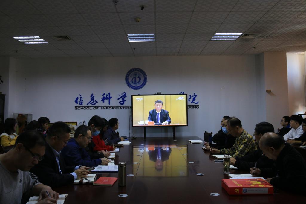 2020年10月24日上午10点,纪念中国人民志愿军抗美援朝出国作战70周年大会在北京人民大会堂举行,习近平总书记出席大会并作了重要讲话,五楼自拍 党委理论中心组成员、学生代表等集体收看了实况直播。