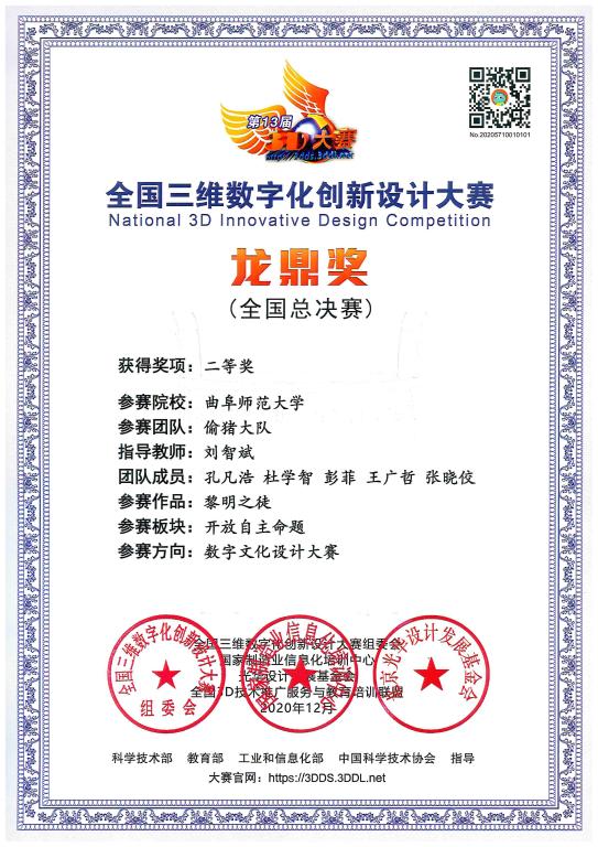 学生孔凡浩、王广哲、杜学智、彭菲、张晓佼等同学在刘智斌老师的指导下,开发了3D电子游戏《黎明之徒》,参加了数字文化设计主题的比赛,以其优美的画面、精彩的环节、优异的性能得到专家评委的一致认可,最终斩获国家二等奖。