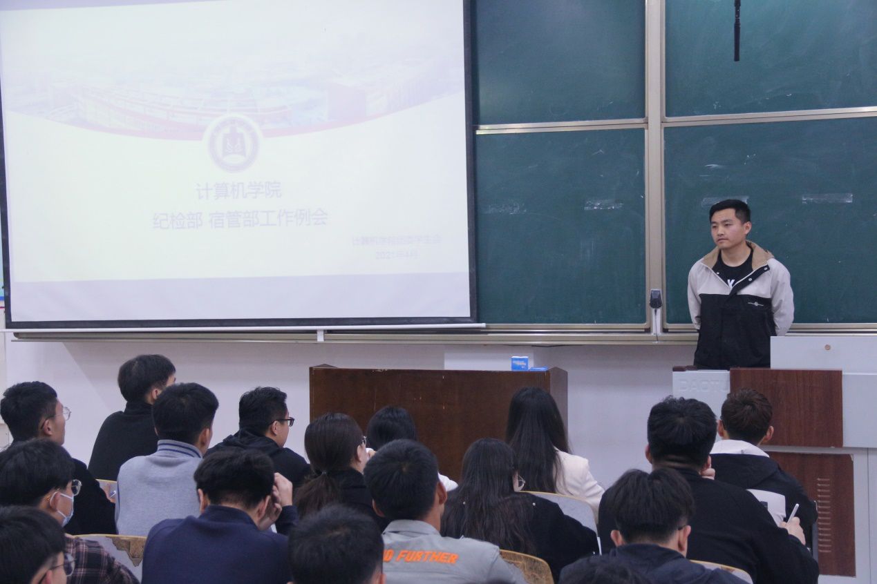 纪检部、宿管部工作例会,2018级辅导员纪玉超主持并出席会议,纪检部、宿管部全体部门成员参加会议。