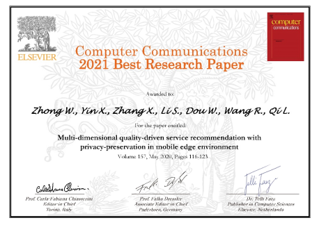 2018级硕士研究生仲伟艺为第一作者(通讯作者:齐连永)的论文《Multi-dimensional Quality-driven Service Recommendation with Privacy-preservation in Mobile Edge Environment》从该期刊去年发表的600余篇论文中脱颖而出,荣获2021年度唯一一篇“最佳研究论文奖”(2021 Best Research Paper Award)。 《Computer Communications》是中国计算机协会推荐的C类期刊,在计算机通讯领域享有广泛的声誉。论文自发表以来,受到国内外学者的广泛关注,2021年3月起持续入选ESI高被引论文及ESI热点论文。本次获奖标志着我校五楼自拍