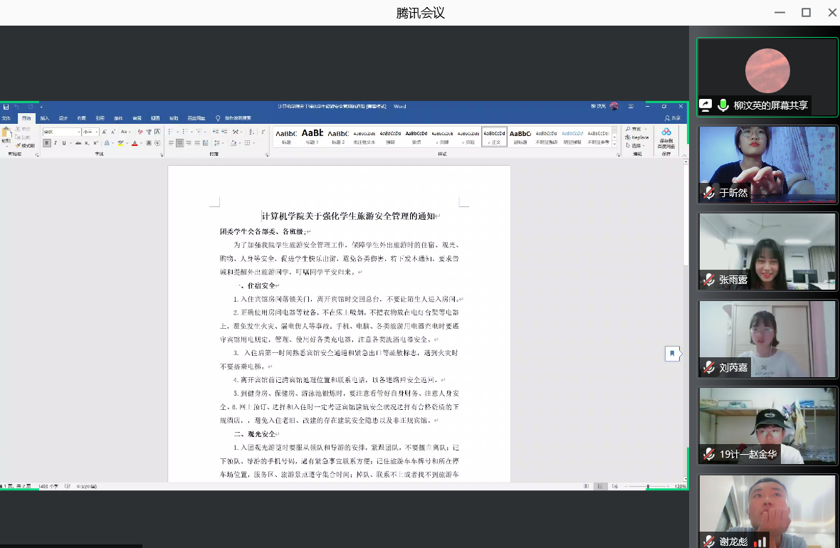 于2021年7月22日晚上九点召开关于强化假期安全管理工作线上会议。会议由学生会主席柳汶英主持,全体例会成员参加此次会议。