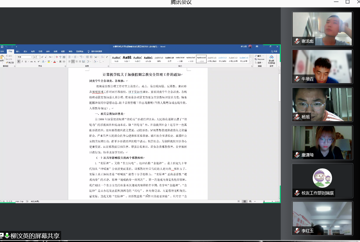 关于加强假期宗教安全管理工作的通知》,通知分为相关宗教知识的普及和重要防范措施两大内容。在相关宗教知识的普及上,柳汶英带同学们了解了近几年影响较大的两个邪教组织,认清邪教危害。在防范措施上,他对三点内容进行强调:(一)掌握正确的宗教知识。通过学校、班级宗教知识普及教育和个人正确途径学习,利用报告、讲座、案例分析等形式,了解邪教本质、危害,树立正确世界观、人生观、价值观,从源头上解决宗教认识和对待问题。(二)提高防范意识。自觉接受反邪教教育,认识宗教与邪教区别,了解邪教骗人手法,增强鉴别力,避免上当受骗。(三)做好信教人员管理。强化班级团支部思想政治教育工作,利用团委学生会各职能部门与班级班委团支部有效管理的交叉功能,形成网格化管理。关注、关爱信教同学,做好信教同学转化工作。