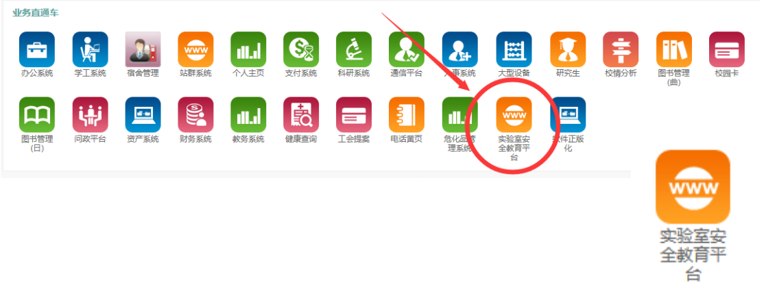 3、信息门户页面最下方“业务直通车”栏目中点击“实验室安全教育平台”图标