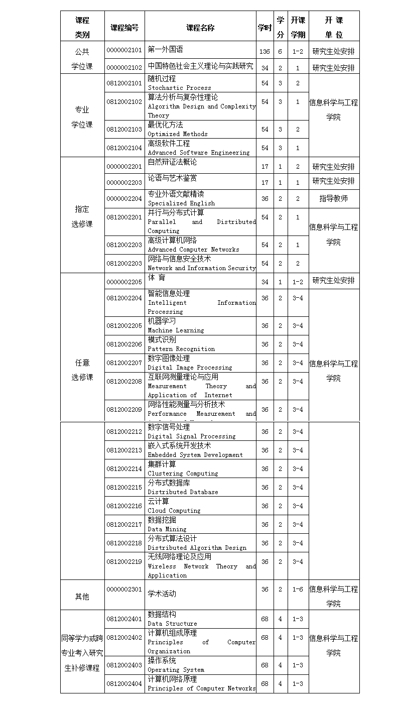 总学分≥37学分,其中学术活动2学分,学位课学分20学分,选修课≥15学分。同等学力或跨专业考入计算机科学与技术学科的硕士研究生应补修至少2门专业课程,补修所得学分不计入总学分。补修课程不再单独开设,可在1,2,3学期内与本科生同修。学分不满足要求,不得进行硕士学位论文答辩。