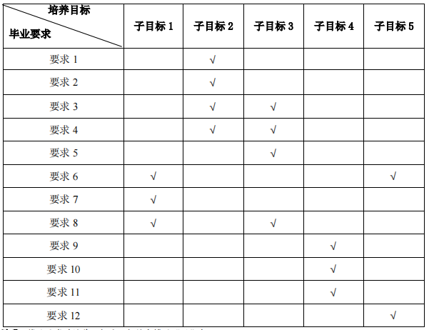 说明:毕业要求对培养目标子目标的支撑用“√”表示。