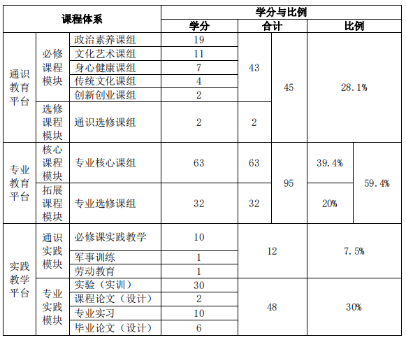 说明:表中通识必修课程模块的43学分中,含通识实践模块中必修课程实践教学的10学分;专业教育平台的95学分中,含专业实践模块实验(实训)的30学分。