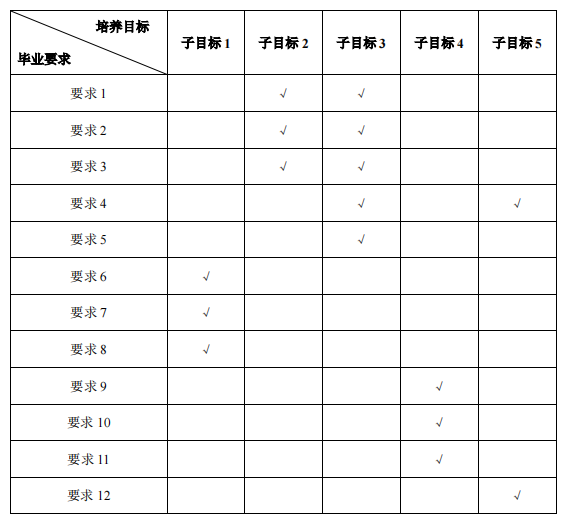 说明:毕业要求对培养目标子目标的支撑用“√”表示。