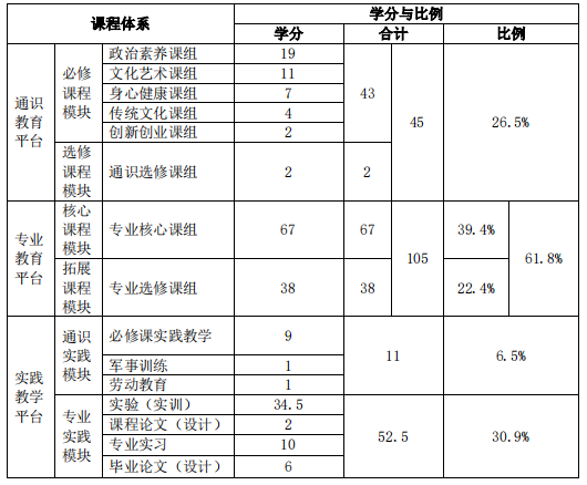 说明:表中通识必修课程模块的43学分中,含通识实践模块中必修课实践教学的9学分,专业教育平台的105学分中,含专业实践模块实验(实训)的34.5学分。