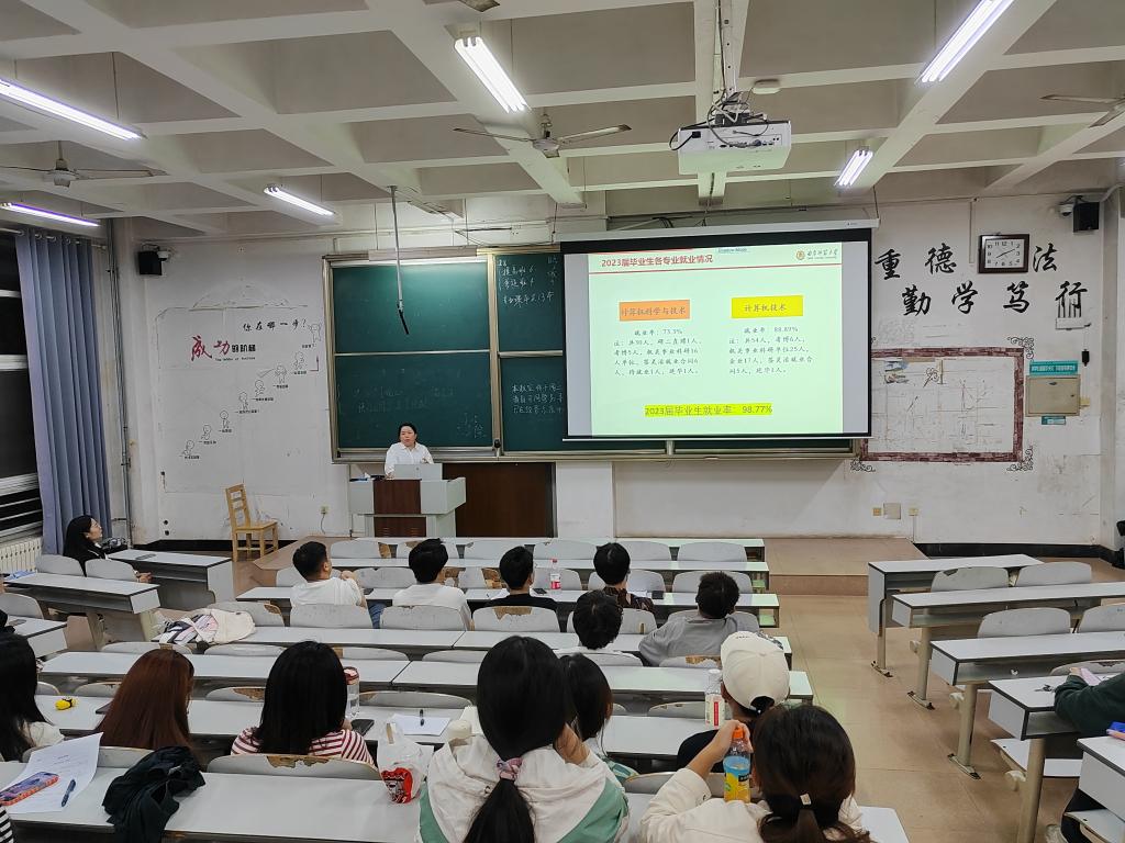 研究生辅导员程荣花老师根据我院近两年毕业研究生升学、就业统计结果,给大家介绍了每年的升学情况、就业率、就业单位性质、就业岗位及薪资待遇等,并对目前就业形势、就业政策、就业特点等几个方面进行了分析,指出我院毕业研究生就业形势将会越来越严峻。要求同学们从研一开始就要做好学业发展规划,树立正确的择业观,合理安排时间,丰富自身履历,提高个人综合素质,为将来进入更高一级学府深造或高质量就业打下坚实的基础。