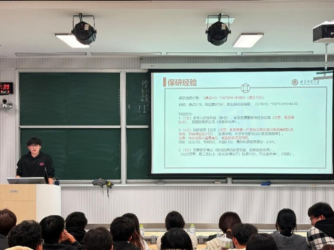 分享会上,赵梦宇结合个人推免经历,围绕当前升学与就业形势展开系统分析。他建议同学们在决定是否考研前,应认真思考自身发展方向,并着重强调了绩点与专业成绩在推免过程中的重要性,鼓励大家扎实学好专业课程,为未来深造与发展奠定坚实基础。