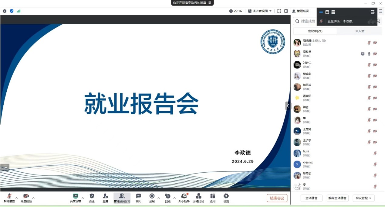 会议伊始,李政德首先详细回顾了自己从求职初期到最终成功入职的整个过程,着重强调了实习经验在求职过程中的重要性,认为实习不仅是了解行业和岗位的好机会,更是自我认知和成长的重要环节。