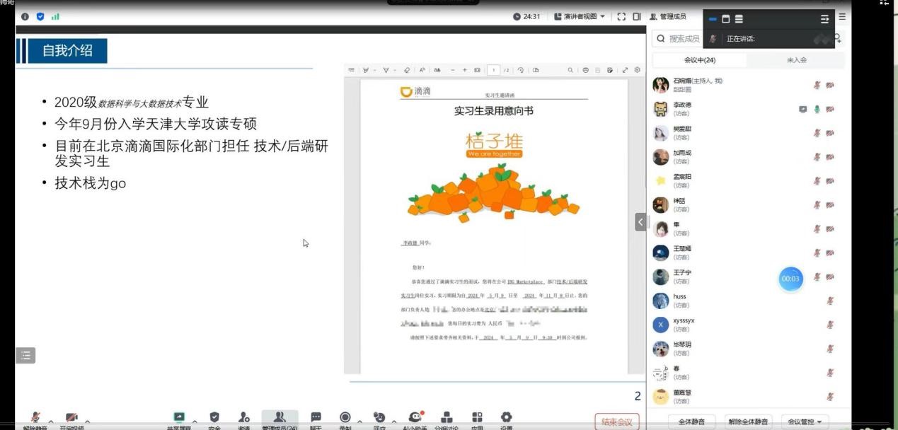 之后,李政德师哥从就业选择、笔试准备、面试技巧和职业规划等多个方面进行了分享。在面试技巧方面,他建议同学们在面试前要对目标公司和岗位进行充分了解,以便于在回答问题时更有针对性,同时他还强调了与面试官互动的重要性,通过眼神交流等方式展现自己的自信和沟通能力。