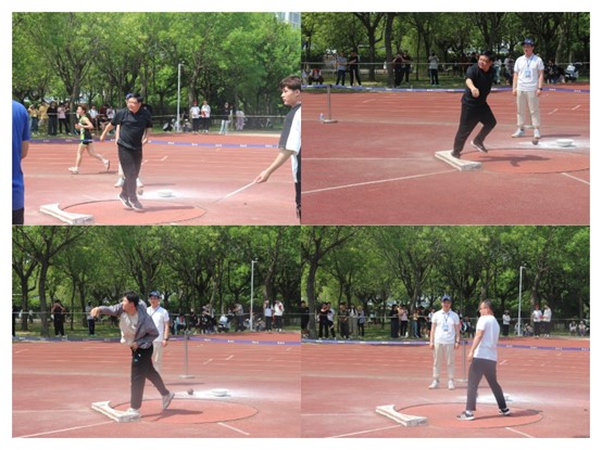 在教工组男子铅球比赛中,老师们也拼尽全力,享受着比赛带来的乐趣,他们全身心投入到比赛当中,深吸一口气,将手中的铅球用力抛掷而出,划出一道道优美的曲线。