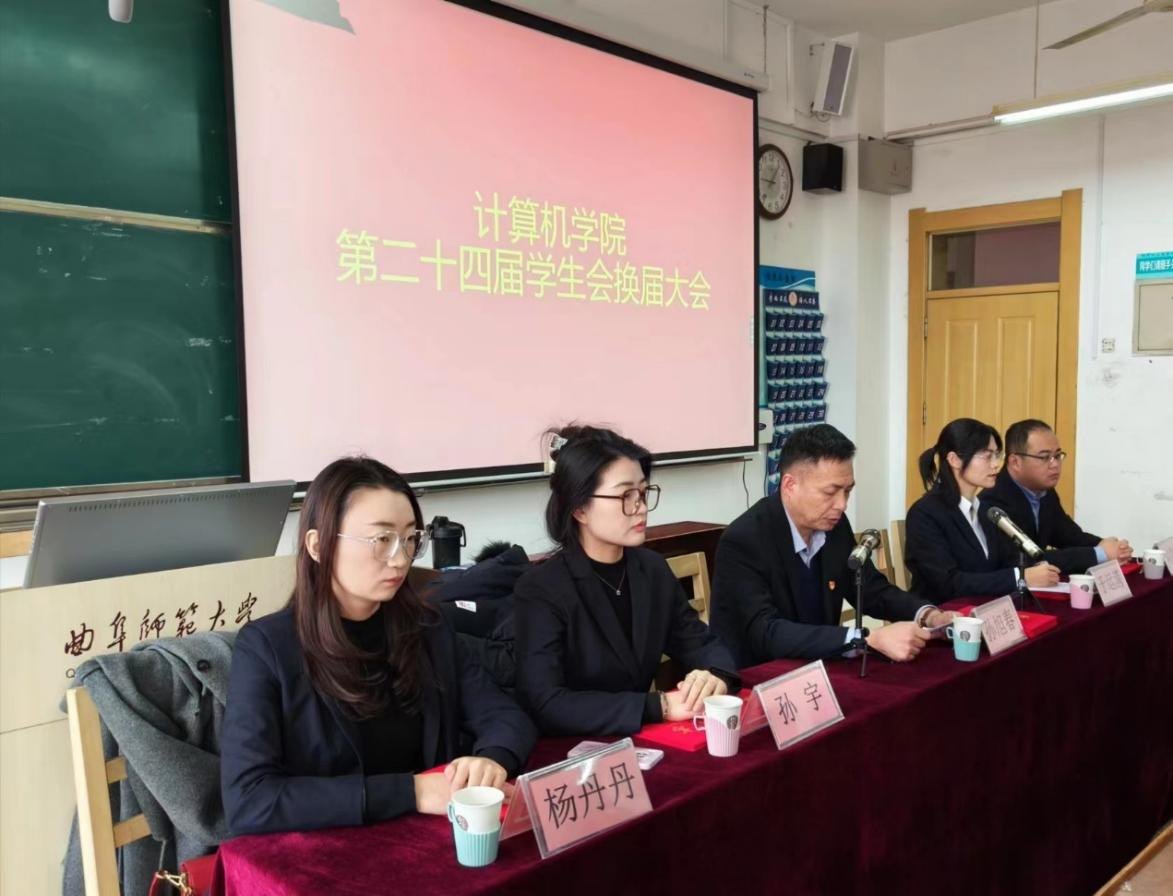 于JC412举办第二十四届学生代表大会,党委副书记孙旭春,团委书记于运清,本科生党支部书记孙宇,辅导员刘兆宇、杨丹丹出席,二十三届、二十四届团委学生会成员参加,23级艾姜欢主持本次会议。