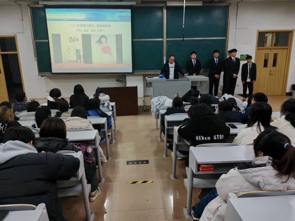 会议中,刘兆宇老师通过讲解礼仪的概述、日常生活中需要注意的形象礼仪、男女生不同站姿、蹲姿、坐姿、颁奖以及茶水的仪表仪态、正式场合中的表情管理、步伐以及迎宾的练习等知识,让同学们意识到礼仪素养的重要性。刘老师还通过模拟颁奖环节、重要会议等情景再现的方式,现场展示了礼仪技能。
