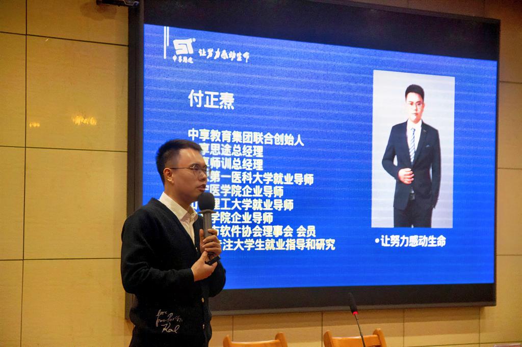 随后,付正焘为同学们进行就业指导宣讲。他从真实的调研数据、鲜活的访谈视频、前沿的行业走向、专业的数据比对中分析当前就业形势,指出学生与用人单位间存在的供需问题与解决方案。他对同学们在就业、面试方面分享四点经验:一是面对当下严峻的就业形势必须主动出击寻找机会,学会搜集整理就业信息和意向行业企业信息,知己知彼方能百战百胜;二是要对症下药:明确简历制作的基本内容以及求职目标,要注重个人能力展示,匹配用人单位招聘需求;三是开放沟通,做好面试准备,明确面试含义及形式,了解面试礼仪,锻炼语言逻辑性;四是懂法守法,掌握就业保障权益,学会用法律武器来保护自身安全以及劳动保障,不轻信高额报酬以防诈骗。