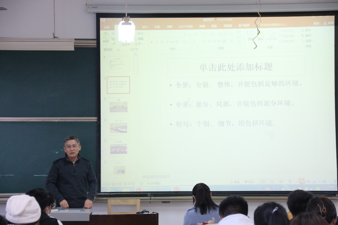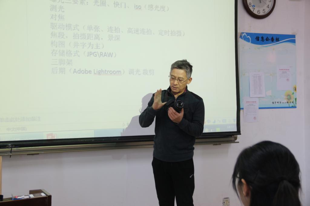 马主任首先从相机构成、基础理论等方面进行了简单介绍,使在座同学对相机的基本使用有了初步认识。接着,马主任从拍摄技巧、拍照姿势、选景角度等不同方面讲解了拍照时的注意事项,分别从小会议室、大会场、运动场等不同地点,从全景、中景、特写等不同方式入手,就景别方面展开深入讲解。同时,马主任也将自己在日常生活中的摄影技巧和经验分享给大家,讲述发生在自己身上摄影趣事,活跃现场气氛,同学们获益匪浅。