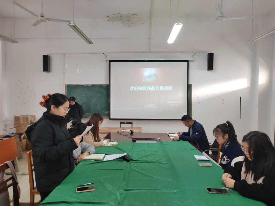 大会第二项,讨论接收预备党员问题。由研究生党支部副书记张睿同志首先向大会报告党员到会情况,大会应到正式党员32名,因事请假5名,实到27名,符合规定人数,表决有效。按照接收预备党员程序规定,胡文蓉、张晨两位同志依次宣读《中国共产党入党志愿书》。由两位同志的入党介绍人依次介绍其培养考察情况,并对其能否入党表明意见。其次,党支部委员会报告对两位发展对象的综合政审情况,经过政治审查,没有发现两位同志在政治上存在问题,也没有发现两位同志的直系亲属和现有社会关系存在影响其加入党组织的问题,同意加入党组织。随后,与会党员酝酿讨论,发表意见,并采取无记名投票方式进行表决。最后,张睿同志宣读了支部大会决议,同意接收两位同志为中共预备党员。