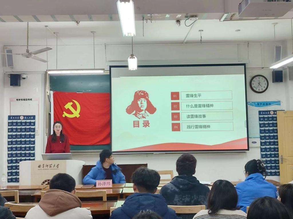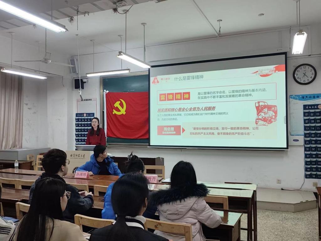 本科生第三党支部书记杨丹丹带领大家共同学习了雷锋生平。鼓励支部成员学习雷锋,以雷锋为榜样,默默奉献,不计个人得失,追求平凡中的伟大。