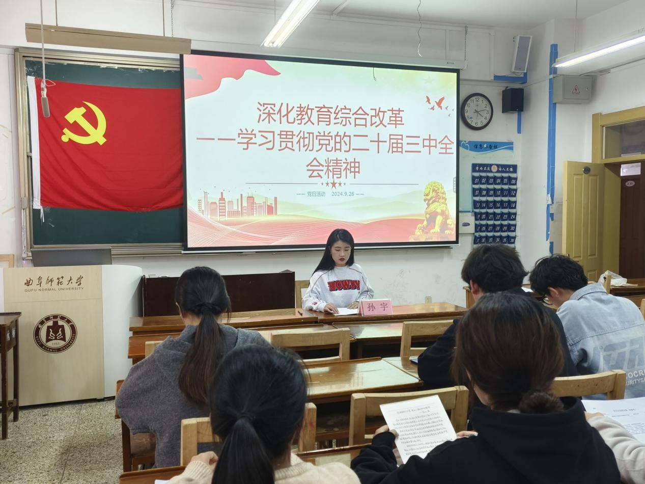 支部书记孙宇带领大家学习了党的二十届三中全会提出的深化教育综合改革的重大任务,强调了要充分认识新时代新征程深化教育综合改革的重大意义,并围绕立德树人、服务国家战略和解决人民群众急难愁盼等方面深入讨论了如何落实教育改革的措施。