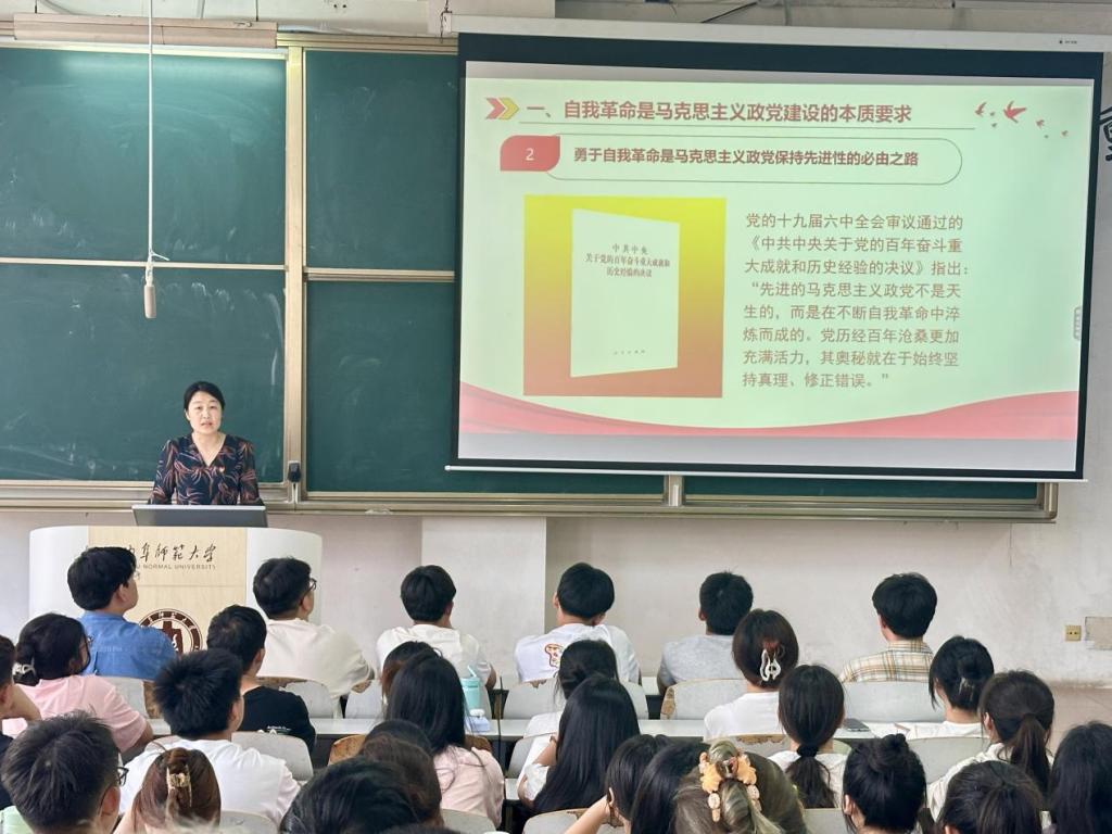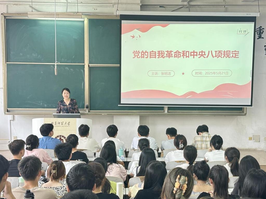 党委书记张明洁于JE103为学院学生干部讲授以“党的自我革命与中央八项规定”为主题的入党启蒙党课。